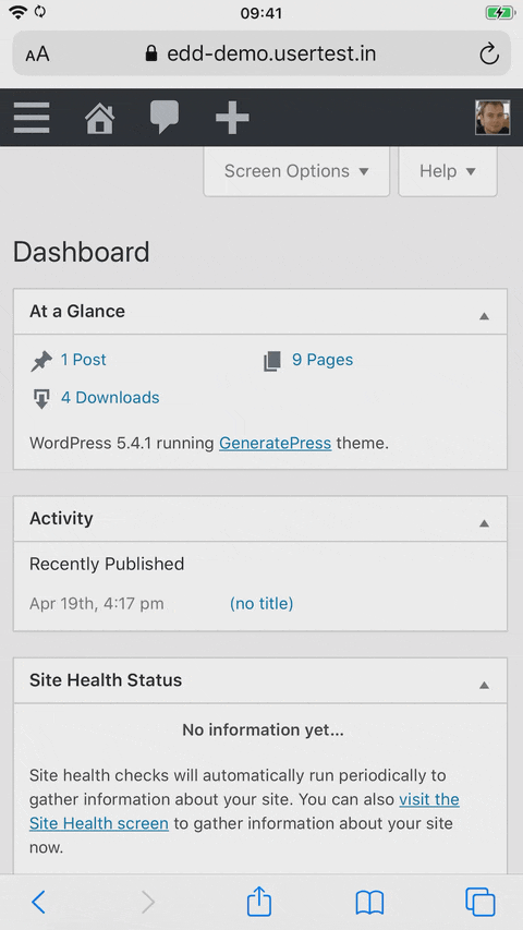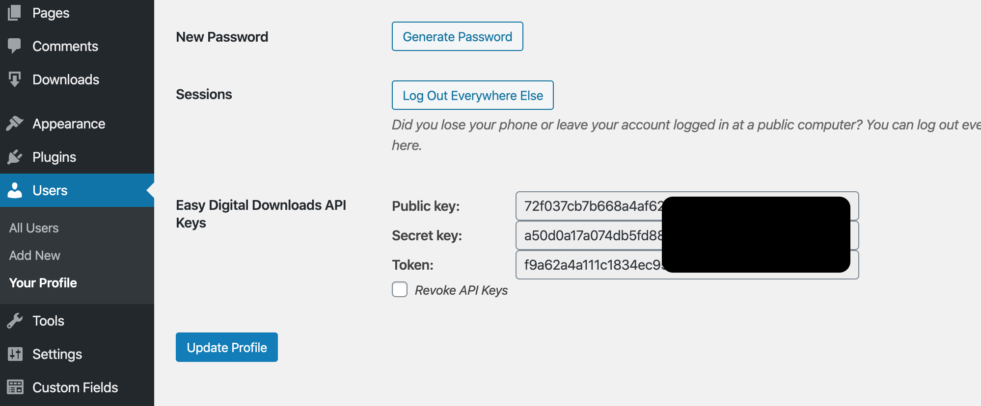 To add a site to the EDD Flux iOS app, you first need your EDD API key and token from your WordPressDashboard.To find your API key, you need to visit your own profile from the WordPress dashboard: